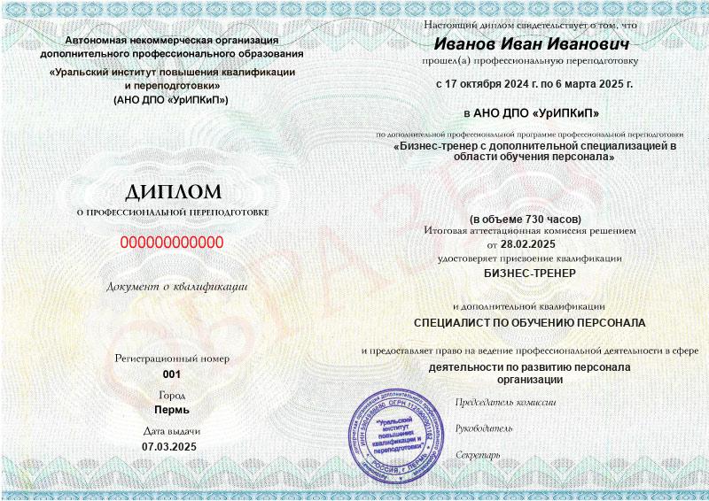 После прохождения курса «Бизнес-тренер с дополнительной специализацией в области обучения персонала» и сдачи итоговой аттестации вы получите диплом установленного образца, который подтвердит квалификацию и приобретенные навыки.