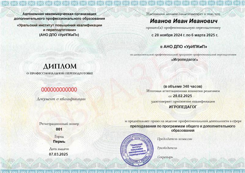 Да, дипломы и удостоверения оформляются в соответствии с действующим законодательством РФ. Документы печатаются на специальных бланках, заверяются печатью АНО ДПО «УрИПКиП».