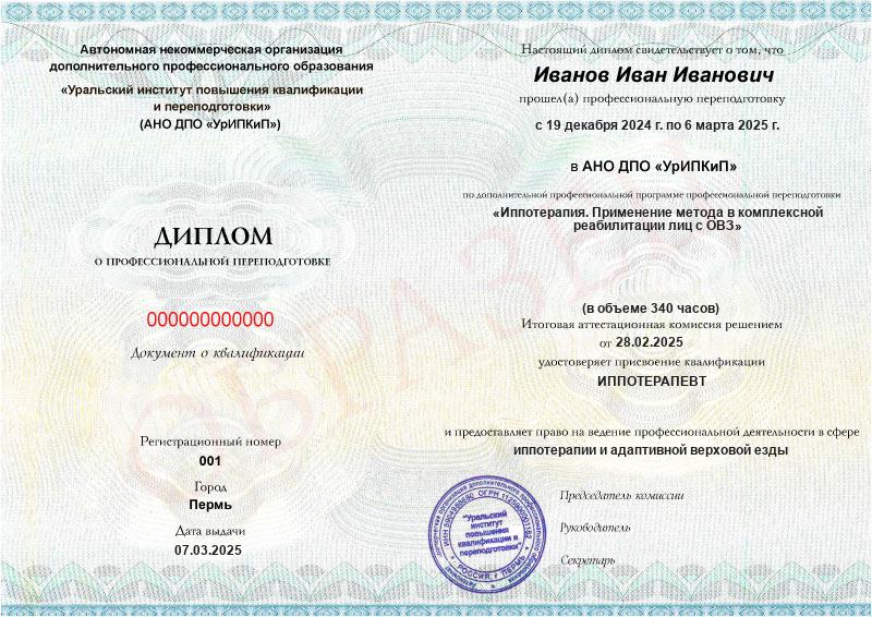 - Квалификация: Иппотерапевт