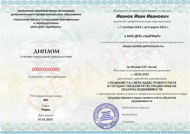 • Квалификация: Специалист в сфере кадастрового учета и государственной регистрации прав на объекты недвижимости
