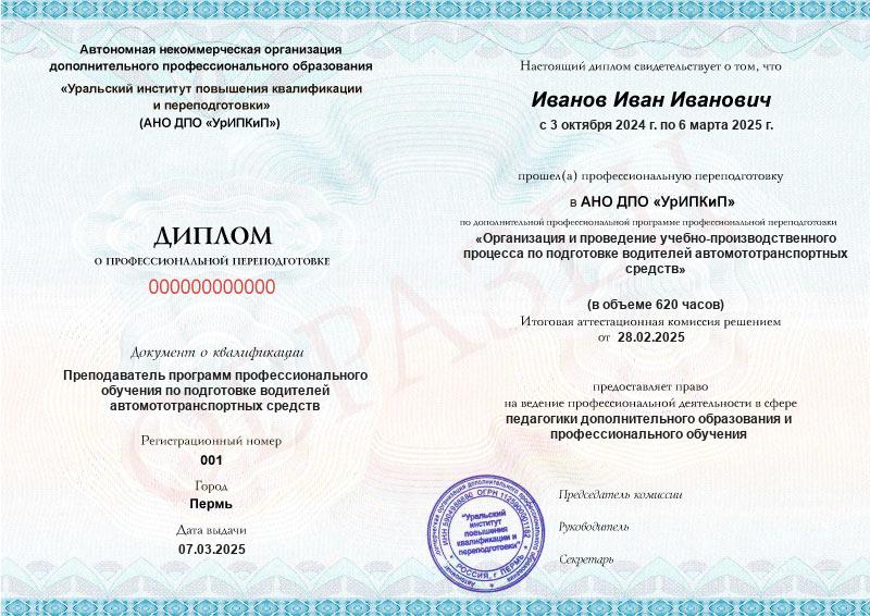 - 2 квалификации: Преподаватель программ профессионального обучения по подготовке водителей автомототранспортных средств + Мастер производственного обучения вождению автомототранспортных средств