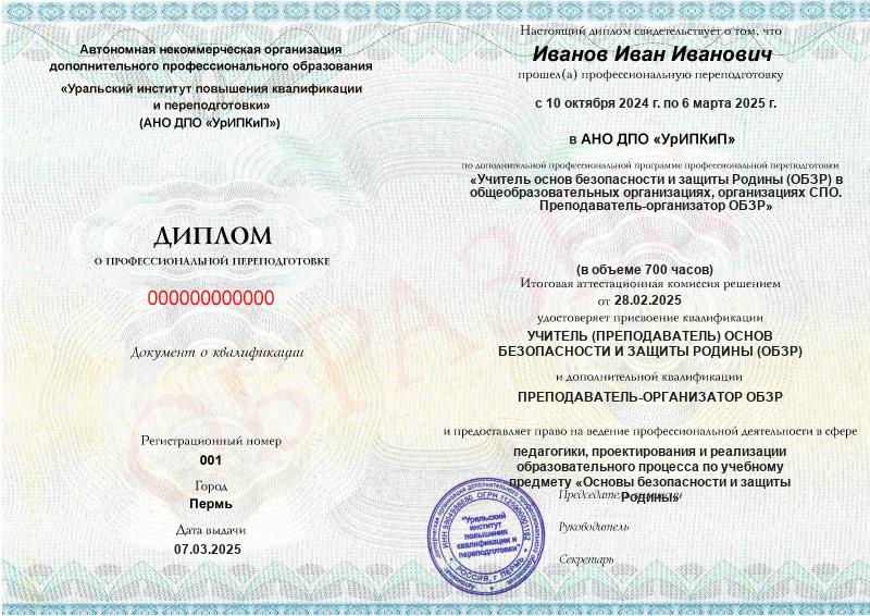 Курс обучения Учитель основ безопасности и защиты Родины (ОБЗР) в общеобразовательных организациях, организациях СПО. Преподаватель-организатор ОБЗР (700ч)