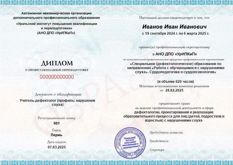- Квалификация: Учитель-дефектолог (профиль: нарушения слуха)