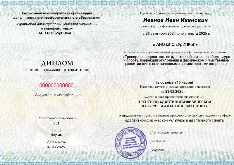 - Квалификация: Тренер по адаптивной физической культуре и адаптивному спорту